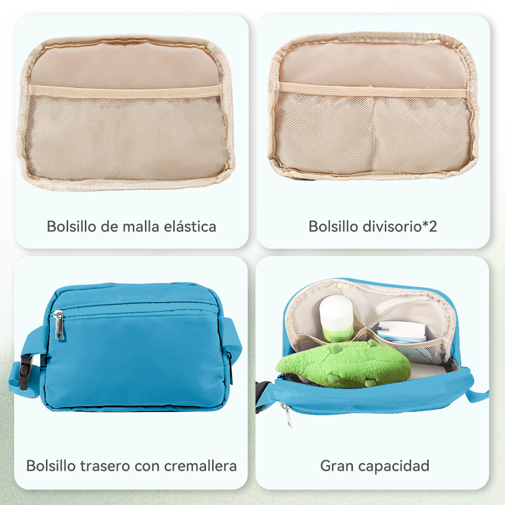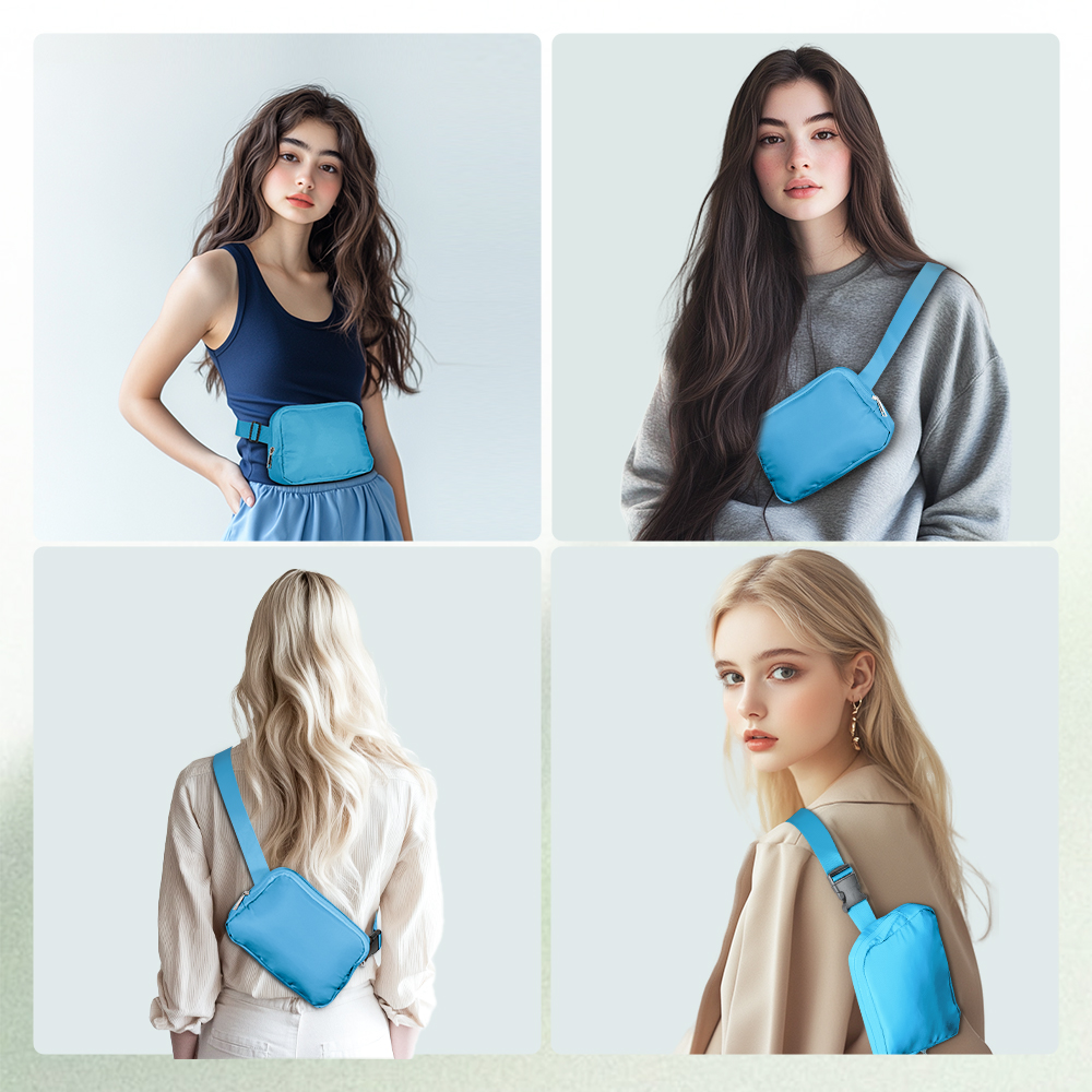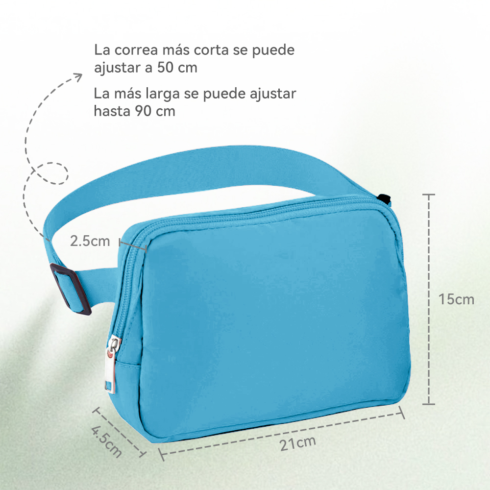 - La correa ajustable le permite ajustar la longitud de la riñonera depende de su demanda. Además, el banano cruzado le permite llevarse de distintas formas y liberar sus manos, como usarlo alrededor de la cintura, sobre el hombro o cruzado. La cremallera suave es más cómoda de usar.