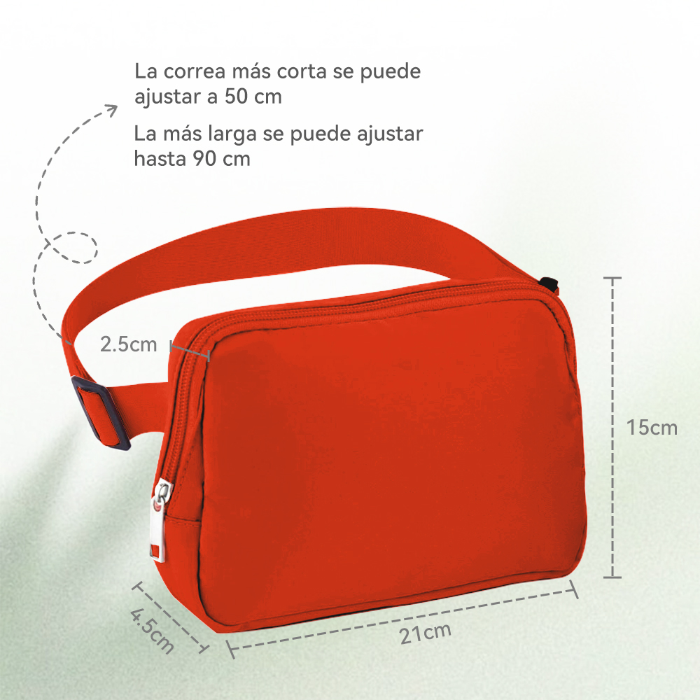 - La correa ajustable le permite ajustar la longitud de la riñonera depende de su demanda. Además, el banano cruzado le permite llevarse de distintas formas y liberar sus manos, como usarlo alrededor de la cintura, sobre el hombro o cruzado. La cremallera suave es más cómoda de usar.