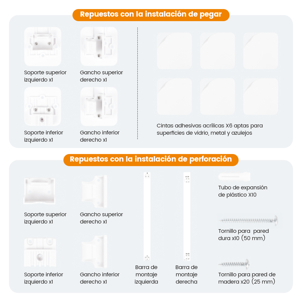 Sin perforar (con adhesivos) – para superficies lisas como vidrio, metal o cerámica; rápido de instalar y fácil de retirar sin dejar marcas.