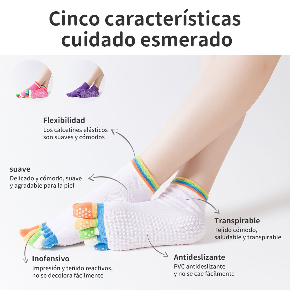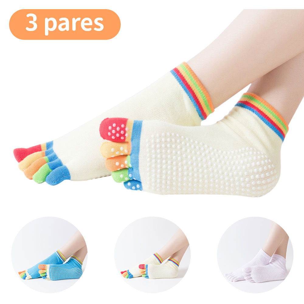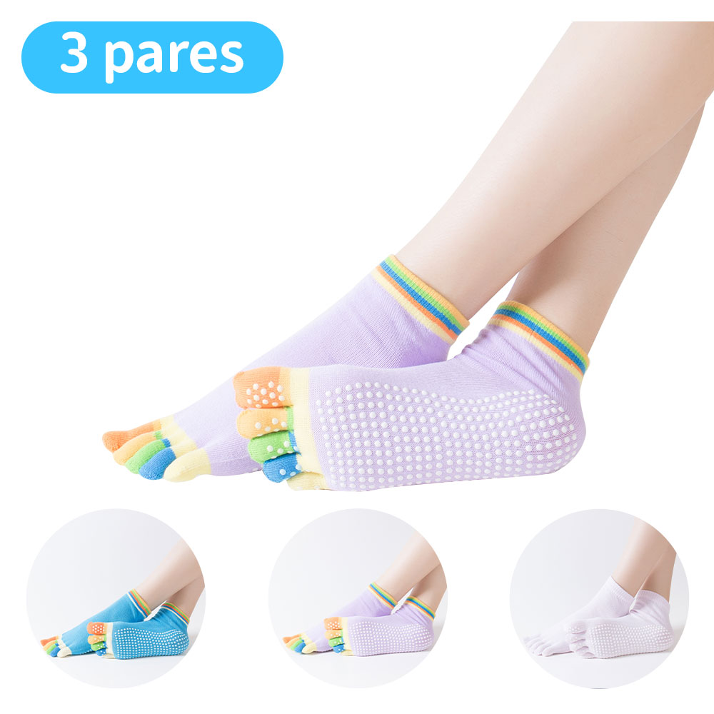 Set de 3 pares de calcetines antideslizantes con dedos multicolores, perfectos para hacer tus ejercicios sin correr el riesgo de caídas.