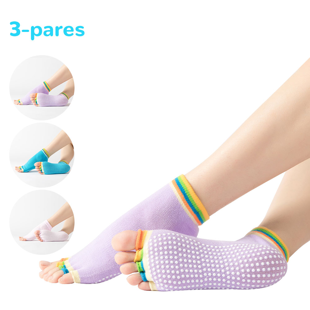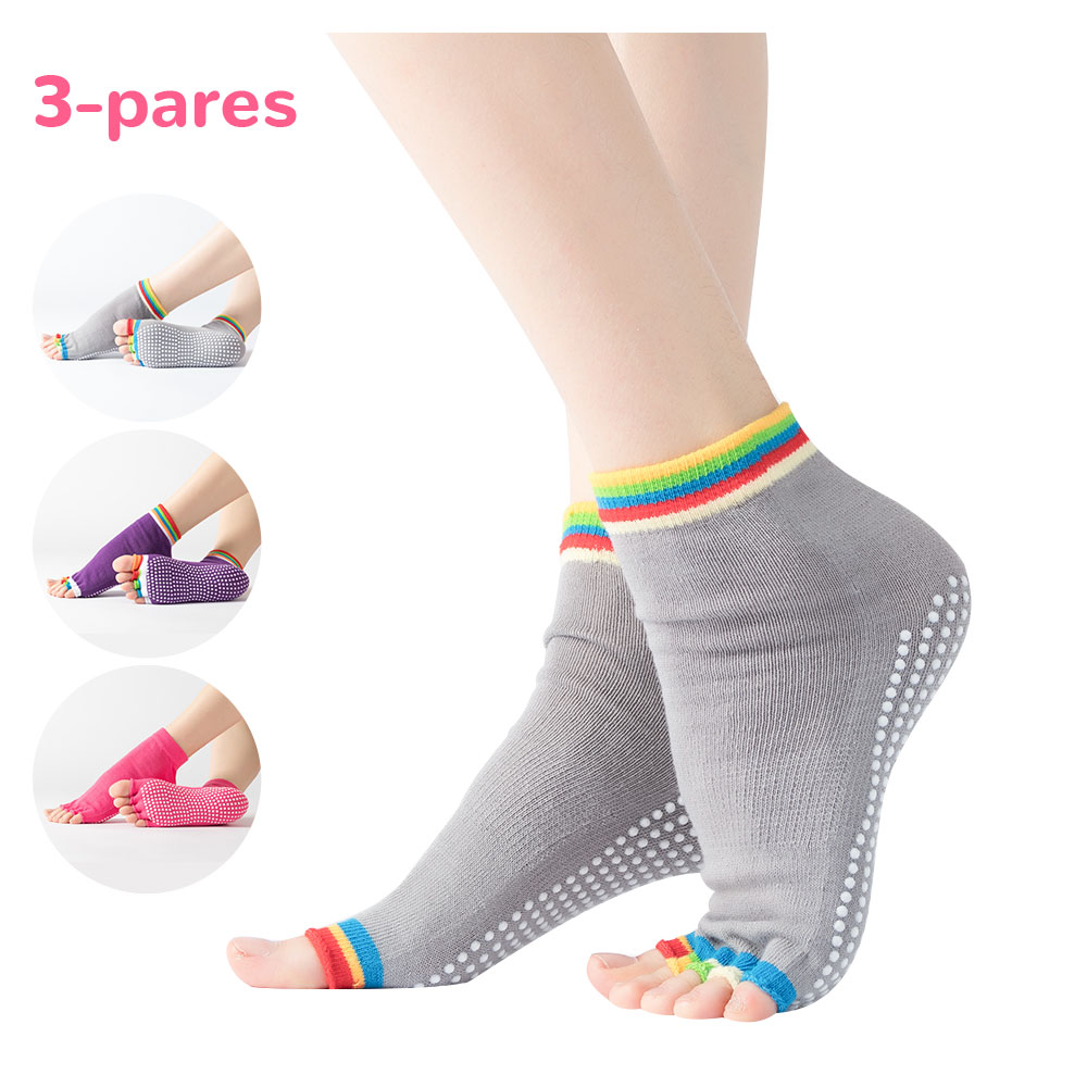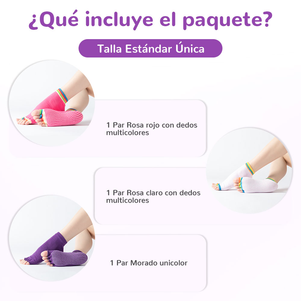 Set de 3 pares de calcetines antideslizantes con dedos multicolores, perfectos para hacer tus ejercicios sin correr el riesgo de caídas.