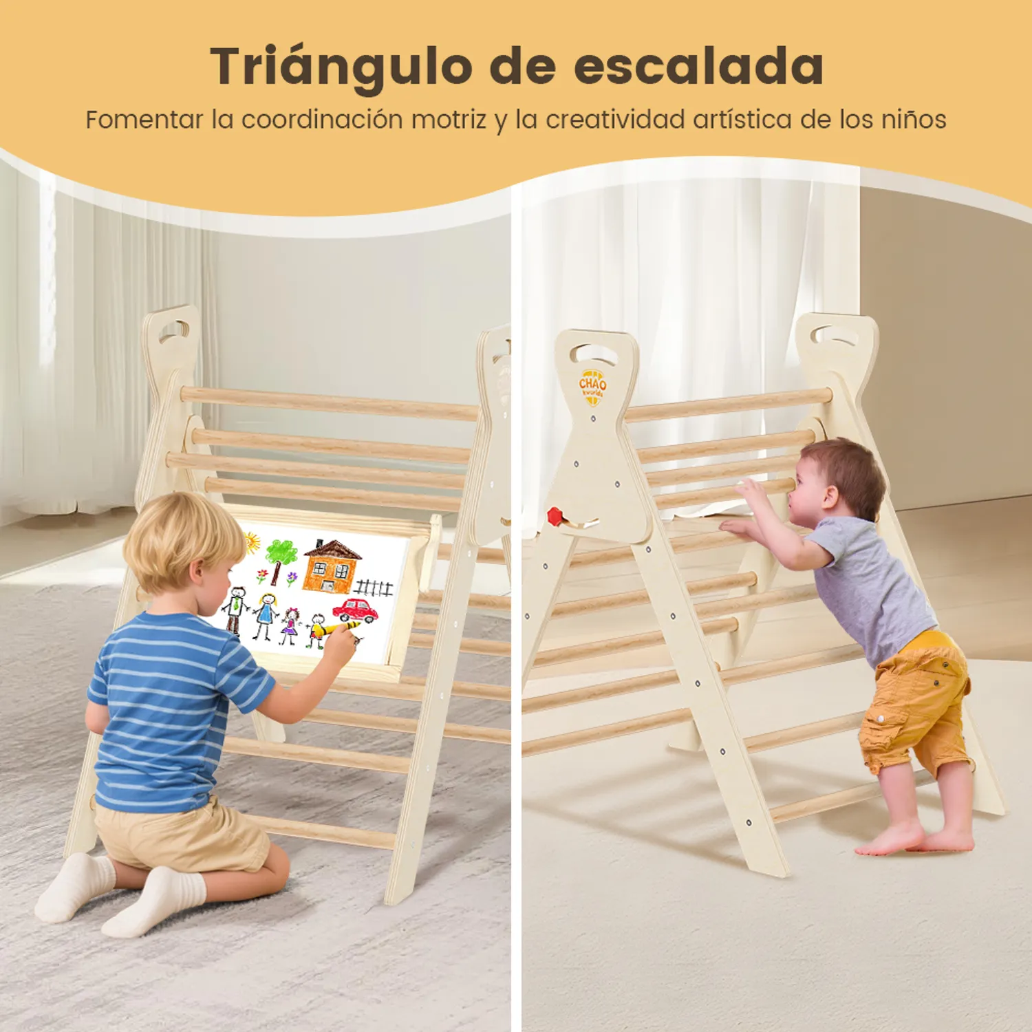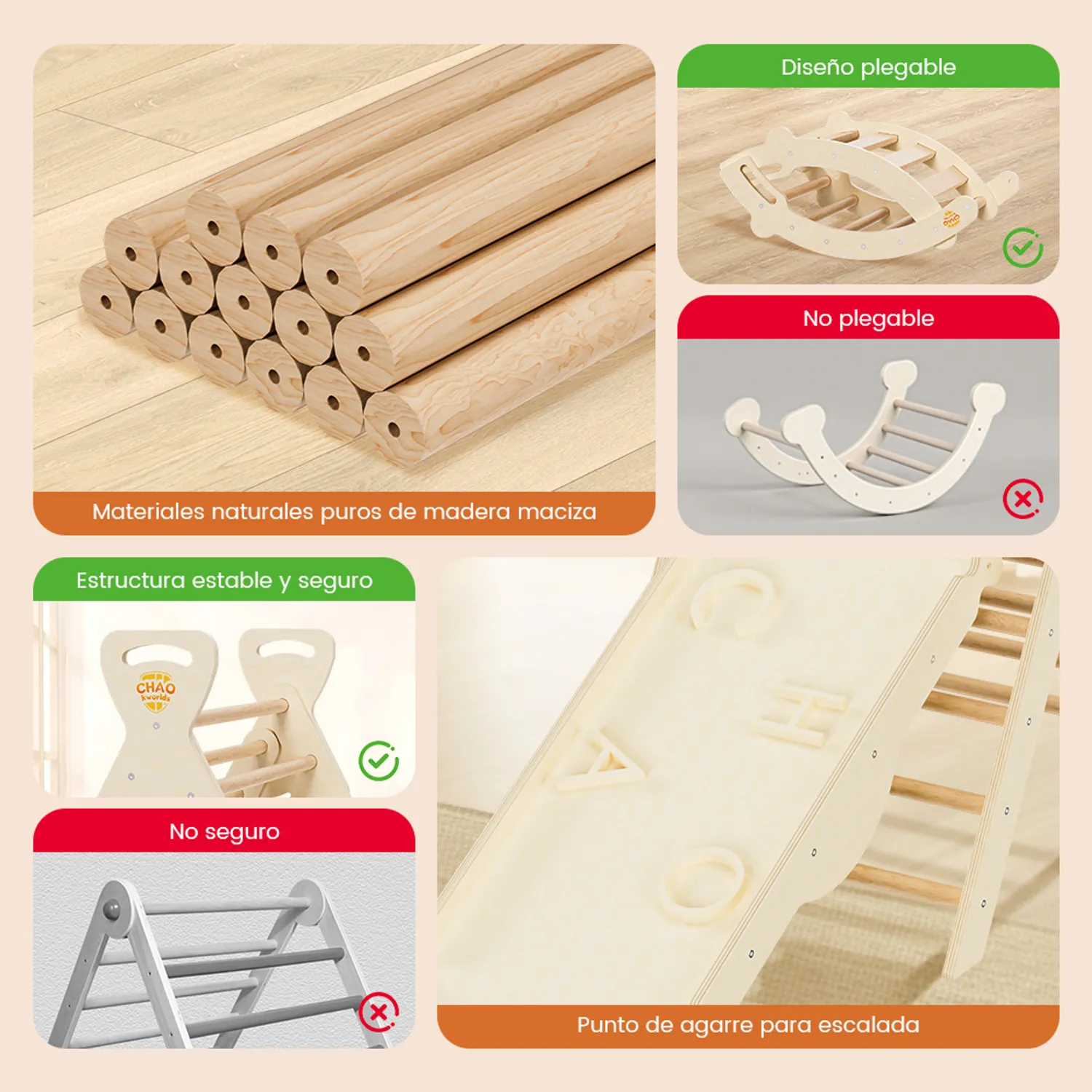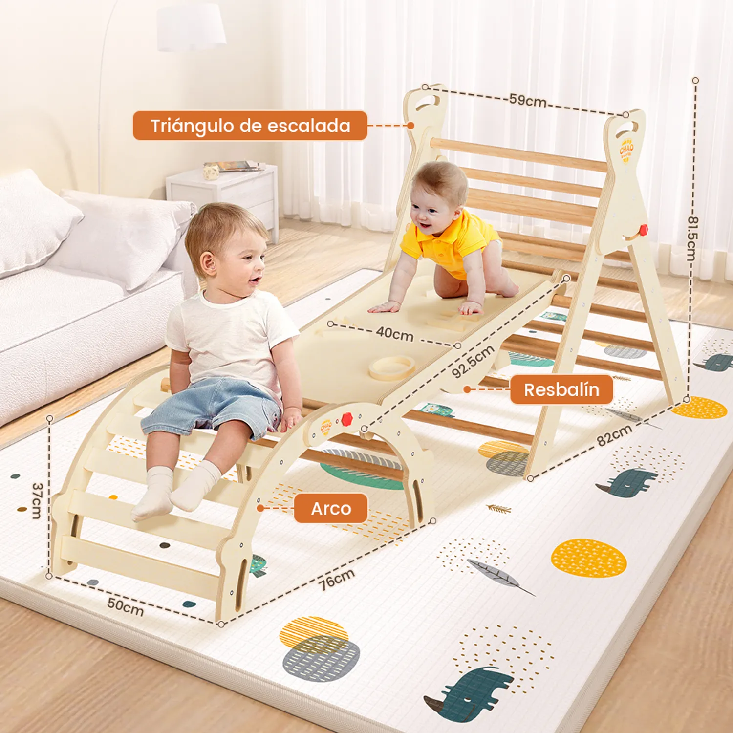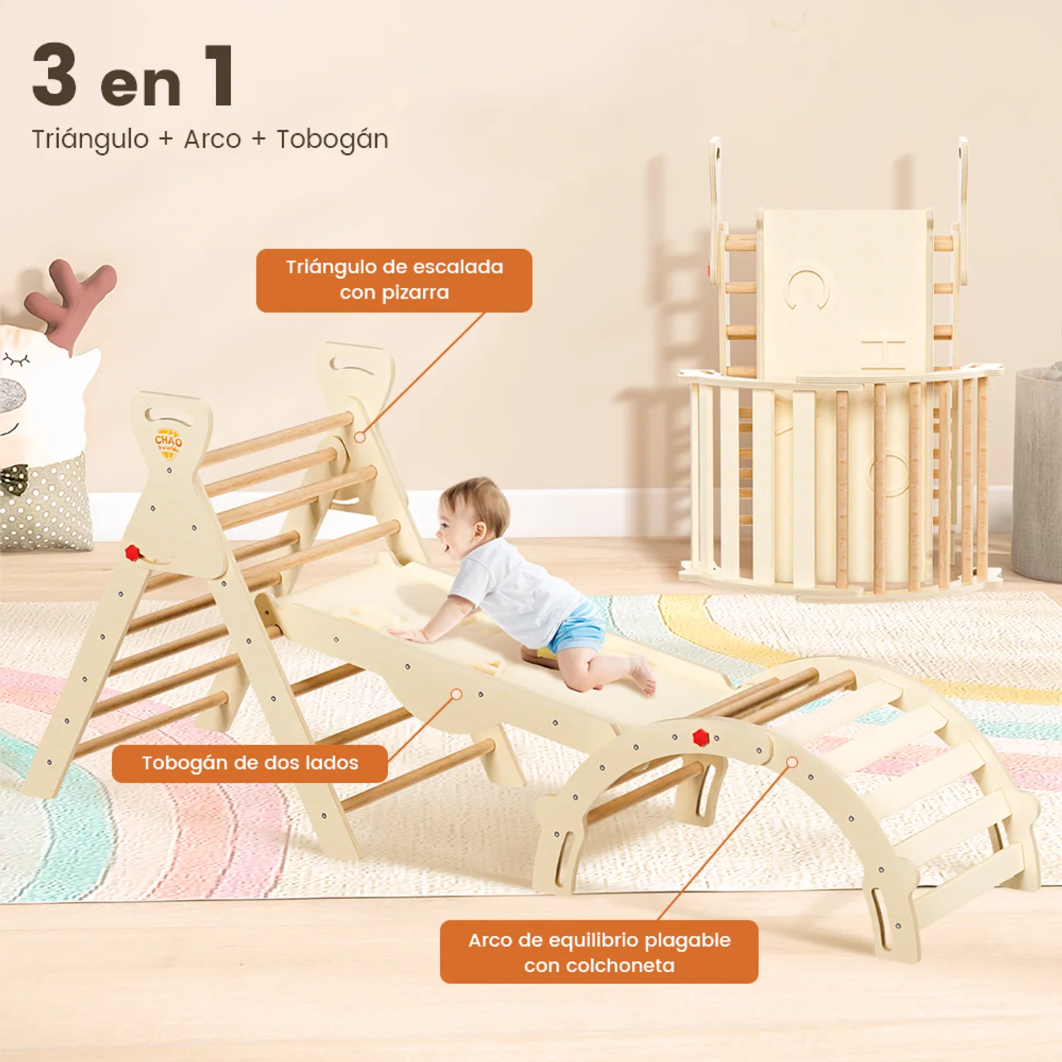 - Tobogán/panel de escalada doble cara: Un lado funciona como tobogán, el otro como panel de escalada con letras “”CHAO”” en relieve para sujetarse.
