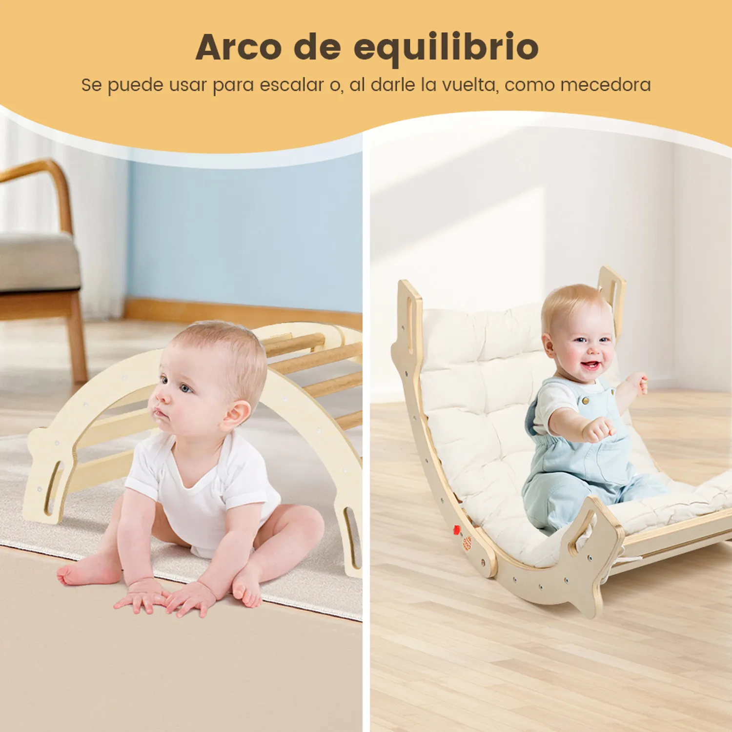 🌈 Puente arqueado / mecedora: Sirve para escalar o como asiento recreativo.