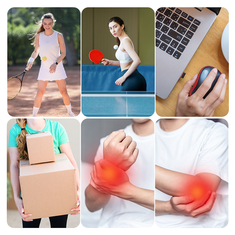 Es conveniente para los hombres y mujeres que hacen el trabajo un poco más pesado, y es adecuado para todo tipo de deportes, como tenis, golf, bádminton, voleibol, baloncesto, ping-pong, levantamiento de pesas, ciclismo y fitness. Se aplica a largas horas de edición por computadora, trabajo, conducción y transporte de cargas. Corrige el síndrome del túnel carpiano, lesiones mecanográficas, lesiones deportivas, distensiones musculares, artritis, tendinitis y el dolor asociado a ellas.