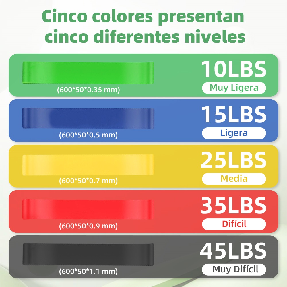 – Cada banda posee una resistencia distinta de entre 10 libras a 45 libras dependiendo del color, las cuales son: