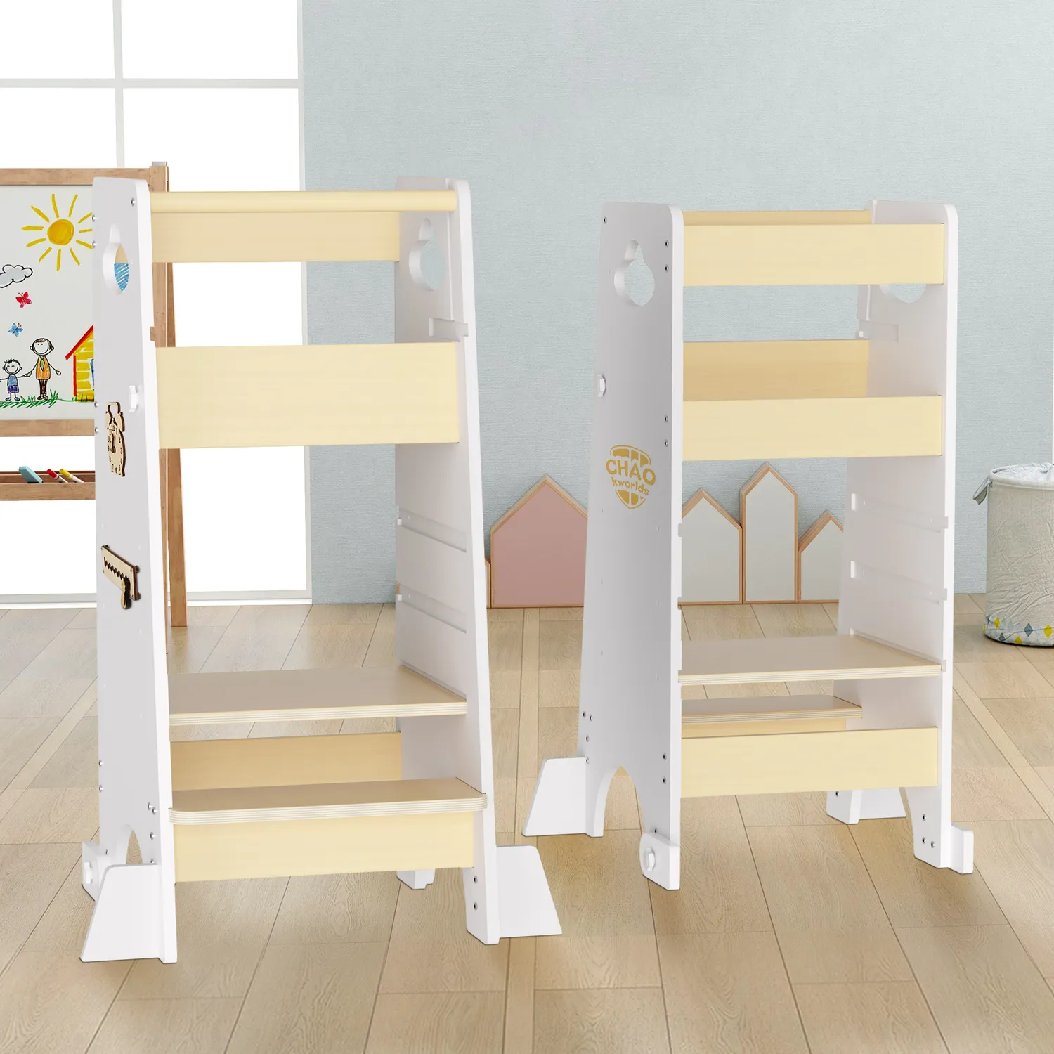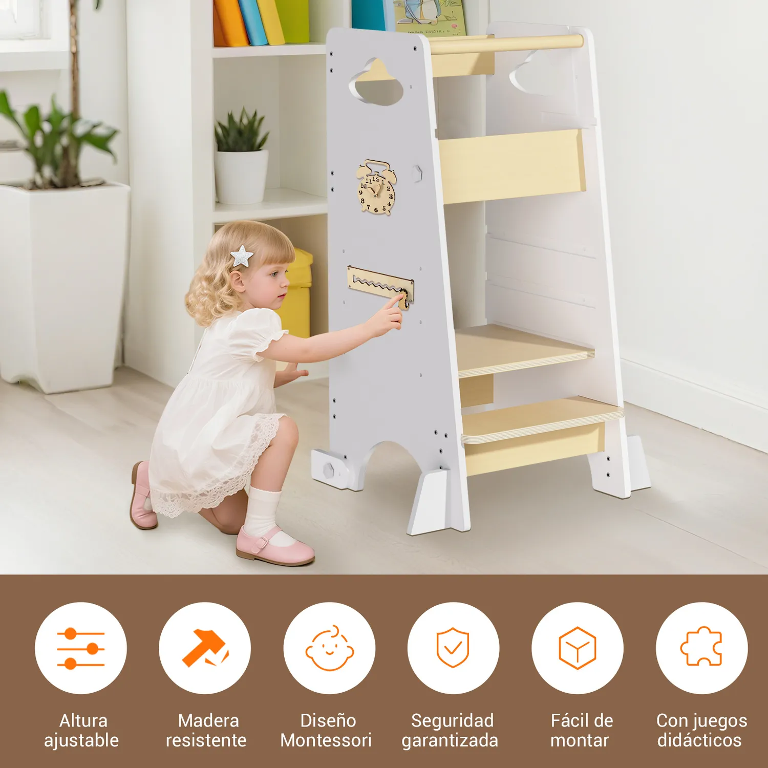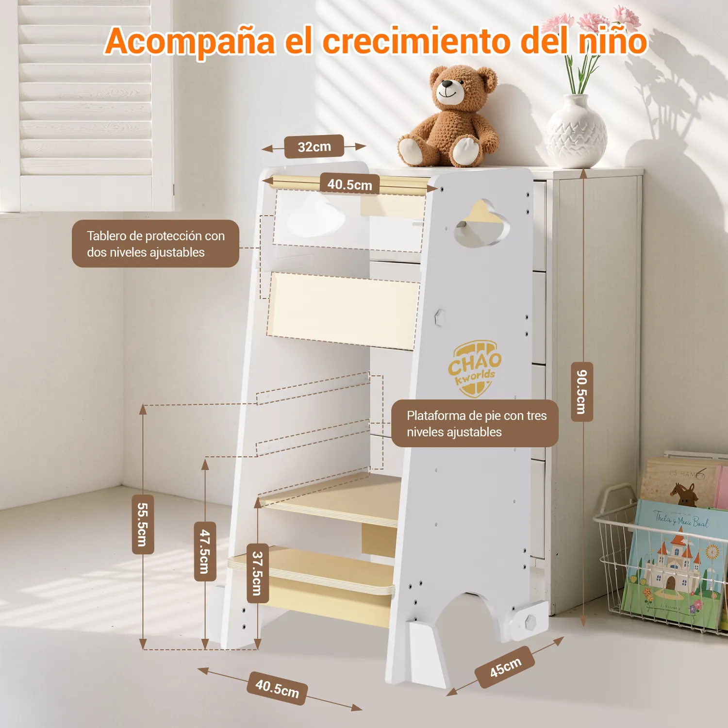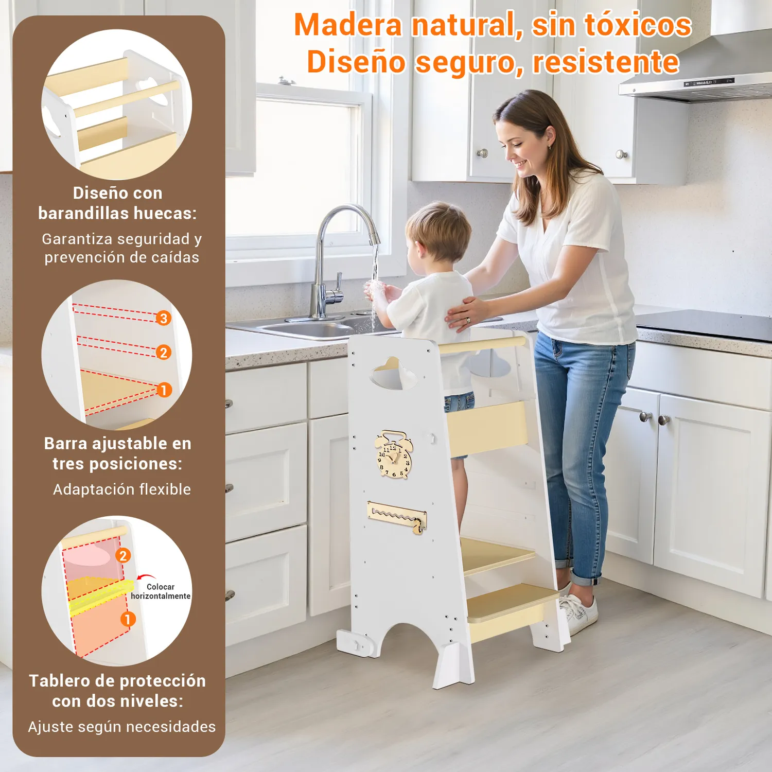 Esta torre de aprendizaje, diseñada especialmente para niños a partir de 24 meses, cuenta con una estructura estable y segura, junto con tres niveles de altura ajustable ergonómicamente, siendo la elección ideal para fomentar su independencia, concentración y habilidades de la vida diaria.