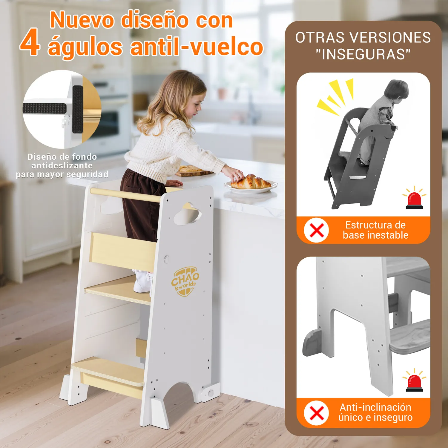 - Nuevo diseño con protección antivuelco en las cuatro esquinas: Esta torre de aprendizaje de cocina incorpora un diseño mejorado de estabilidad que aumenta en un 15% la firmeza frente a un taburete infantil común, ofreciendo seguridad incluso para los más activos.